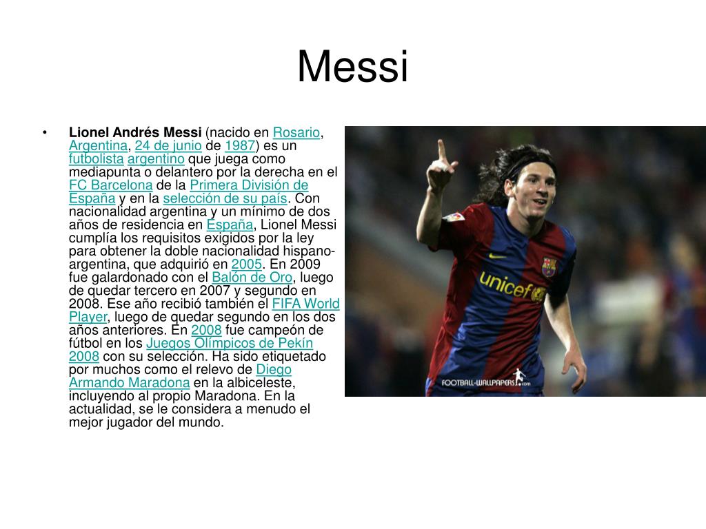 Lionel Andrés Messi (nacido en Rosario, Argentina, 24 de junio de 1987) es un futbolistaargentino que juega como mediapunta o delantero por la derecha en el FC Barcelona de la Primera División de España y en la selección de su país. Con nacionalidad argentina y un mínimo de dos años de residencia en España, Lionel Messi cumplía los requisitos exigidos por la ley para obtener la doble nacionalidad hispano-argentina, que adquirió en 2005. En 2009 fue galardonado con el Balón de Oro, luego de quedar tercero en 2007 y segundo en 2008. Ese año recibió también el FIFA World Player, luego de quedar segundo en los dos años anteriores. En 2008 fue campeón de fútbol en los Juegos Olímpicos de Pekín 2008 con su selección. Ha sido etiquetado por muchos como el relevo de Diego Armando Maradona en la albiceleste, incluyendo al propio Maradona. En la actualidad, se le considera a menudo el mejor jugador del mundo. Messi