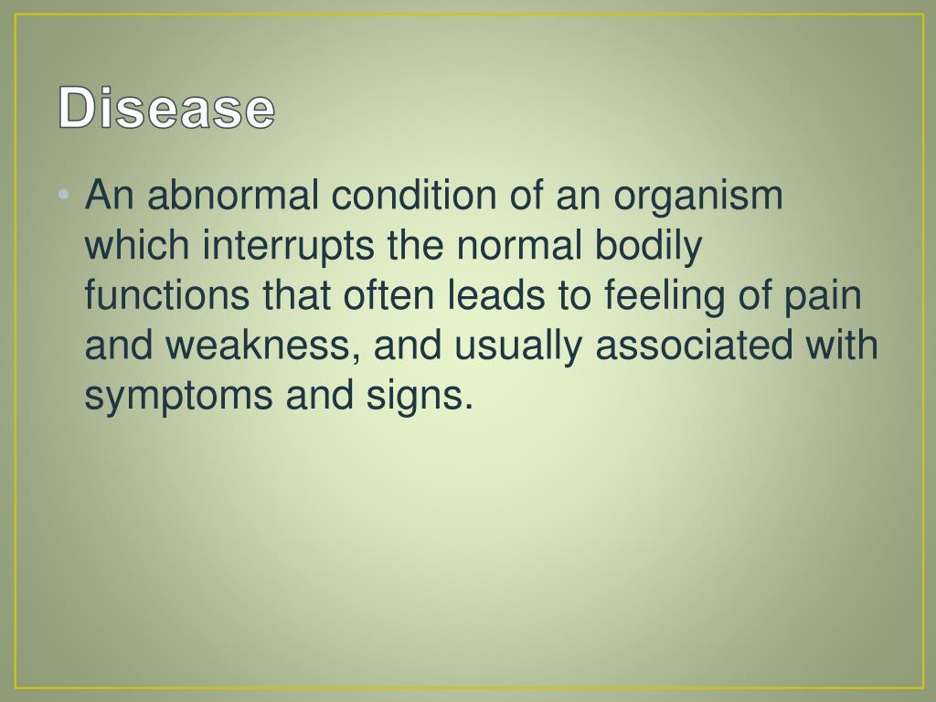 Disease • An abnormal condition of an organism which interrupts the normal bodily functions that often leads to feeling of pain and weakness, and usually associated with symptoms and signs.
