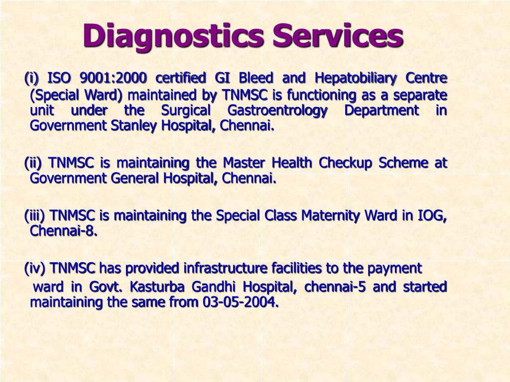 Diagnostics Services (i) ISO 9001:2000 certified GI Bleed and Hepatobiliary Centre (Special Ward) maintained by TNMSC is functioning as a separate unit under the Surgical Gastroentrology Department in Government Stanley Hospital, Chennai. (ii) TNMSC is maintaining the Master Health Checkup Scheme at Government General Hospital, Chennai. (iii) TNMSC is maintaining the Special Class Maternity Ward in IOG, Chennai-8. (iv) TNMSC has provided infrastructure facilities to the payment ward in Govt. Kasturba Gandhi Hospital, chennai-5 and started maintaining the same from 03-05-2004.