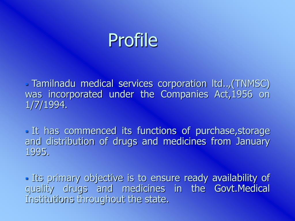 Profile • Tamilnadu medical services corporation ltd..,(TNMSC) was incorporated under the Companies Act,1956 on 1/7/1994. • It has commenced its functions of purchase,storage and distribution of drugs and medicines from January 1995. • Its primary objective is to ensure ready availability of quality drugs and medicines in the Govt.Medical Institutions throughout the state.