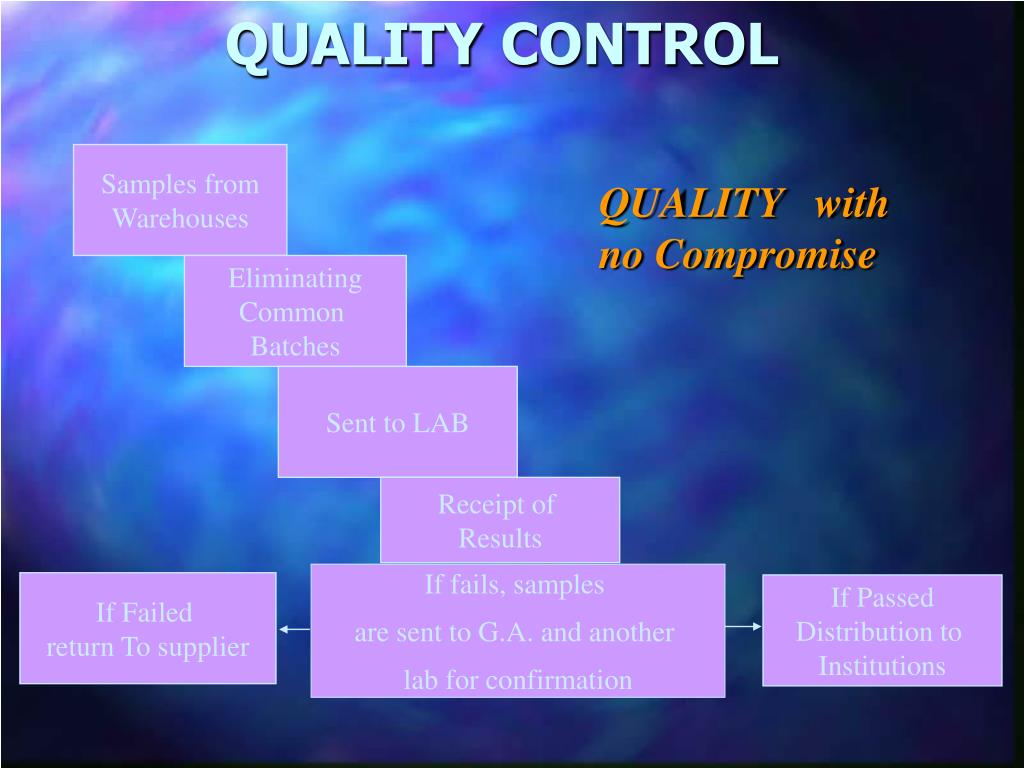 QUALITYCONTROL Samples from Warehouses QUALITY with no Compromise Eliminating Common Batches Sent to LAB Receipt of Results If fails, samples are sent to G.A. and another lab for confirmation If Failed return To supplier If Passed Distribution to Institutions