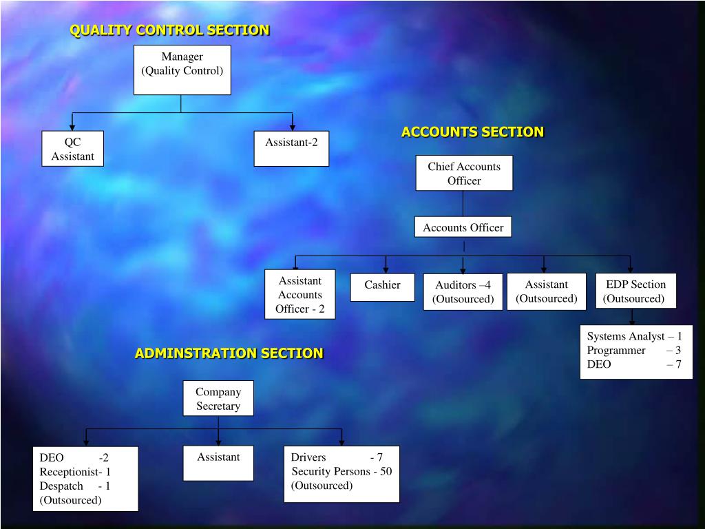 QUALITY CONTROL SECTION Manager (Quality Control) ACCOUNTS SECTION QC Assistant Assistant-2 Chief Accounts Officer Accounts Officer Assistant Accounts Officer - 2 Assistant (Outsourced) EDP Section (Outsourced) Cashier Auditors –4 (Outsourced) Systems Analyst – 1 Programmer – 3 DEO – 7 ADMINSTRATION SECTION Company Secretary Assistant Drivers - 7 Security Persons - 50 (Outsourced) DEO -2 Receptionist- 1 Despatch - 1 (Outsourced)