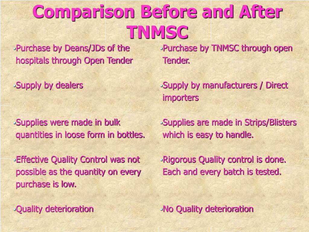 Purchase and Supply of equipments to hospitals • TNMSC has finalized rate contract (CPC System) through open tender for the purchase of equipments & accessories required for 19 departments in Government hospitals consisting of about 3078 items for the period 2002-2004. The medical institutions can directly place purchase orders with the approved firms for the supply of required equipments and accessories at the approved rates depending upon the budget provision. • The medical equipments required for the government hospitals are procured and supplied by TNMSC based on the Government order issued for this purpose from time to time