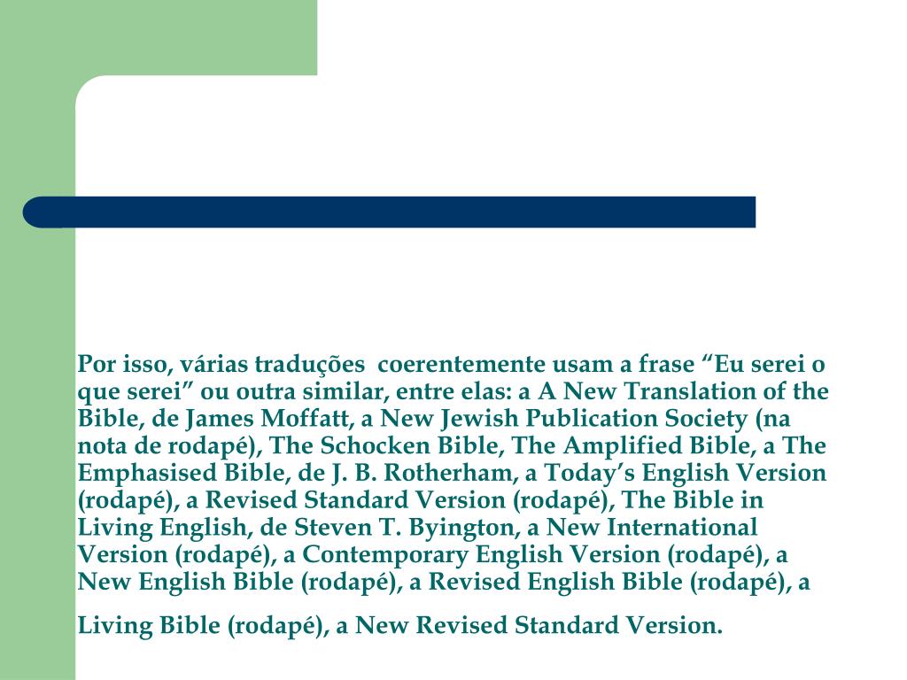 Por isso, várias traduções coerentemente usam a frase “Eu serei o que serei” ou outra similar, entre elas: a A New Translation of the Bible, de James Moffatt, a New Jewish Publication Society (na nota de rodapé), The Schocken Bible, The Amplified Bible, a The Emphasised Bible, de J. B. Rotherham, a Today’s English Version (rodapé), a Revised Standard Version (rodapé), The Bible in Living English, de Steven T. Byington, a New International Version (rodapé), a Contemporary English Version (rodapé), a New English Bible (rodapé), a Revised English Bible (rodapé), a Living Bible (rodapé), a New Revised Standard Version.