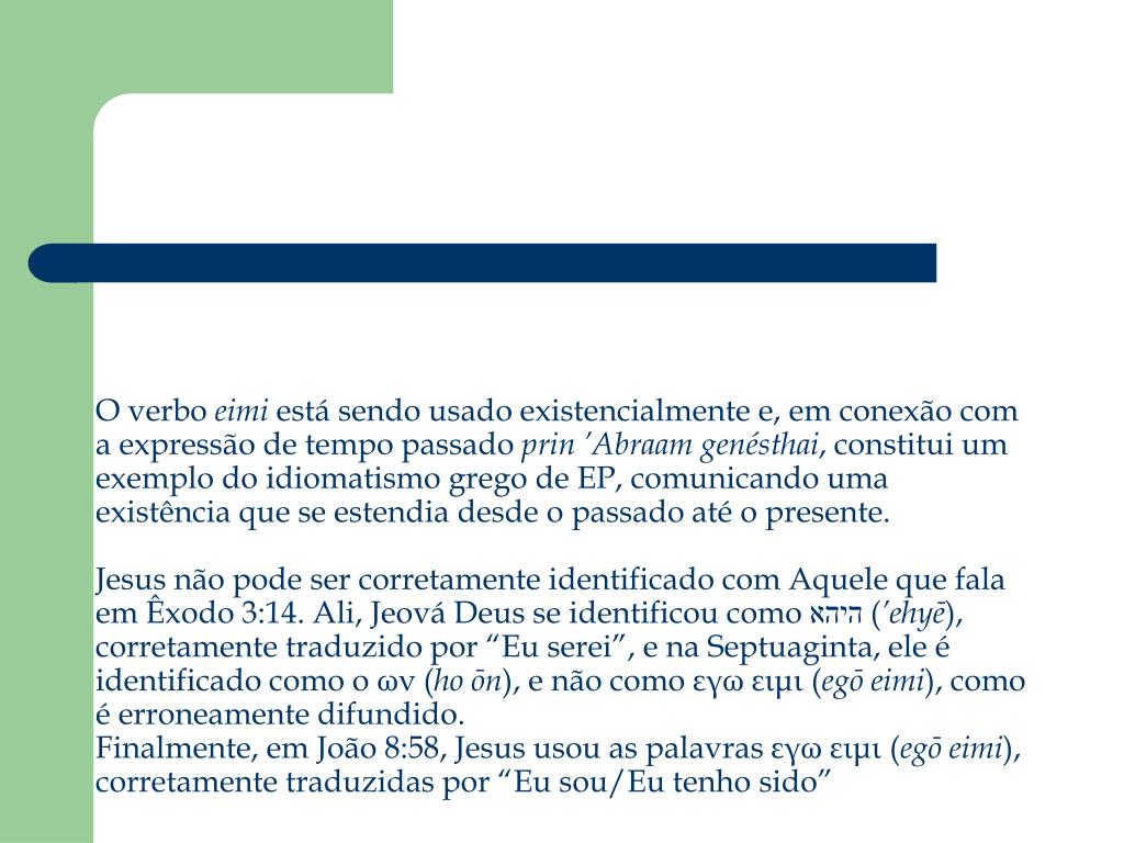 O verbo eimi está sendo usado existencialmente e, em conexão com a expressão de tempo passado prin ’Abraam genésthai, constitui um exemplo do idiomatismo grego de EP, comunicando uma existência que se estendia desde o passado até o presente. Jesus não pode ser corretamente identificado com Aquele que fala em Êxodo 3:14. Ali, Jeová Deus se identificou como היהא (’ehyē), corretamente traduzido por “Eu serei”, e na Septuaginta, ele é identificado como ο ων (ho ōn), e não como εγω ειμι (egō eimi), como é erroneamente difundido. Finalmente, em João 8:58, Jesus usou as palavras εγω ειμι (egō eimi), corretamente traduzidas por “Eu sou/Eu tenho sido”