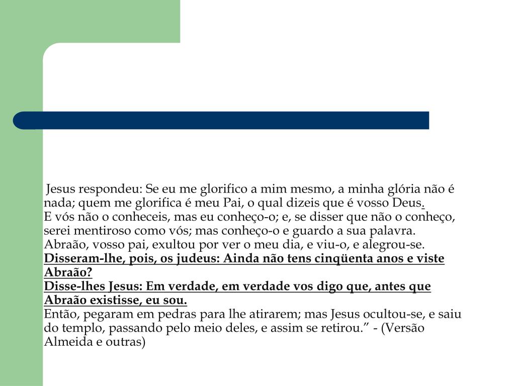 Jesus respondeu: Se eu me glorifico a mim mesmo, a minha glória não é nada; quem me glorifica é meu Pai, o qual dizeis que é vosso Deus.E vós não o conheceis, mas eu conheço-o; e, se disser que não o conheço, serei mentiroso como vós; mas conheço-o e guardo a sua palavra.Abraão, vosso pai, exultou por ver o meu dia, e viu-o, e alegrou-se.Disseram-lhe, pois, os judeus: Ainda não tens cinqüenta anos e viste Abraão?Disse-lhes Jesus: Em verdade, em verdade vos digo que, antes que Abraão existisse, eu sou.Então, pegaram em pedras para lhe atirarem; mas Jesus ocultou-se, e saiu do templo, passando pelo meio deles, e assim se retirou.” - (Versão Almeida e outras)