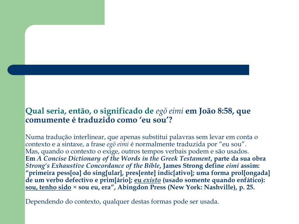 Qual seria, então, o significado de egō eimiem João 8:58, que comumente é traduzido como ‘eu sou’?Numa tradução interlinear, que apenas substitui palavras sem levar em conta o contexto e a sintaxe, a frase egō eimi é normalmente traduzida por “eu sou”.Mas, quando o contexto o exige, outros tempos verbais podem e são usados.Em A Concise Dictionary of the Words in the Greek Testament, parte da sua obra Strong’s Exhaustive Concordance of the Bible, James Strong define eimi assim: “primeira pess[oa] do sing[ular], pres[ente] indic[ativo]; uma forma prol[ongada] de um verbo defectivo e prim[ário]; eu existo (usado somente quando enfático): sou, tenho sido × sou eu, era”, Abingdon Press (New York: Nashville), p. 25. Dependendo do contexto, qualquer destas formas pode ser usada.