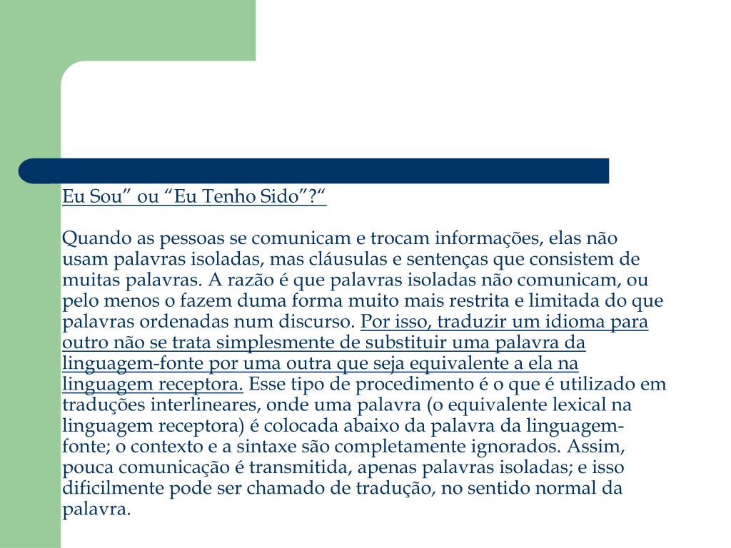 Eu Sou” ou “Eu Tenho Sido”?“Quando as pessoas se comunicam e trocam informações, elas não usam palavras isoladas, mas cláusulas e sentenças que consistem de muitas palavras. A razão é que palavras isoladas não comunicam, ou pelo menos o fazem duma forma muito mais restrita e limitada do que palavras ordenadas num discurso. Por isso, traduzir um idioma para outro não se trata simplesmente de substituir uma palavra da linguagem-fonte por uma outra que seja equivalente a ela na linguagem receptora. Esse tipo de procedimento é o que é utilizado em traduções interlineares, onde uma palavra (o equivalente lexical na linguagem receptora) é colocada abaixo da palavra da linguagem-fonte; o contexto e a sintaxe são completamente ignorados. Assim, pouca comunicação é transmitida, apenas palavras isoladas; e isso dificilmente pode ser chamado de tradução, no sentido normal da palavra.