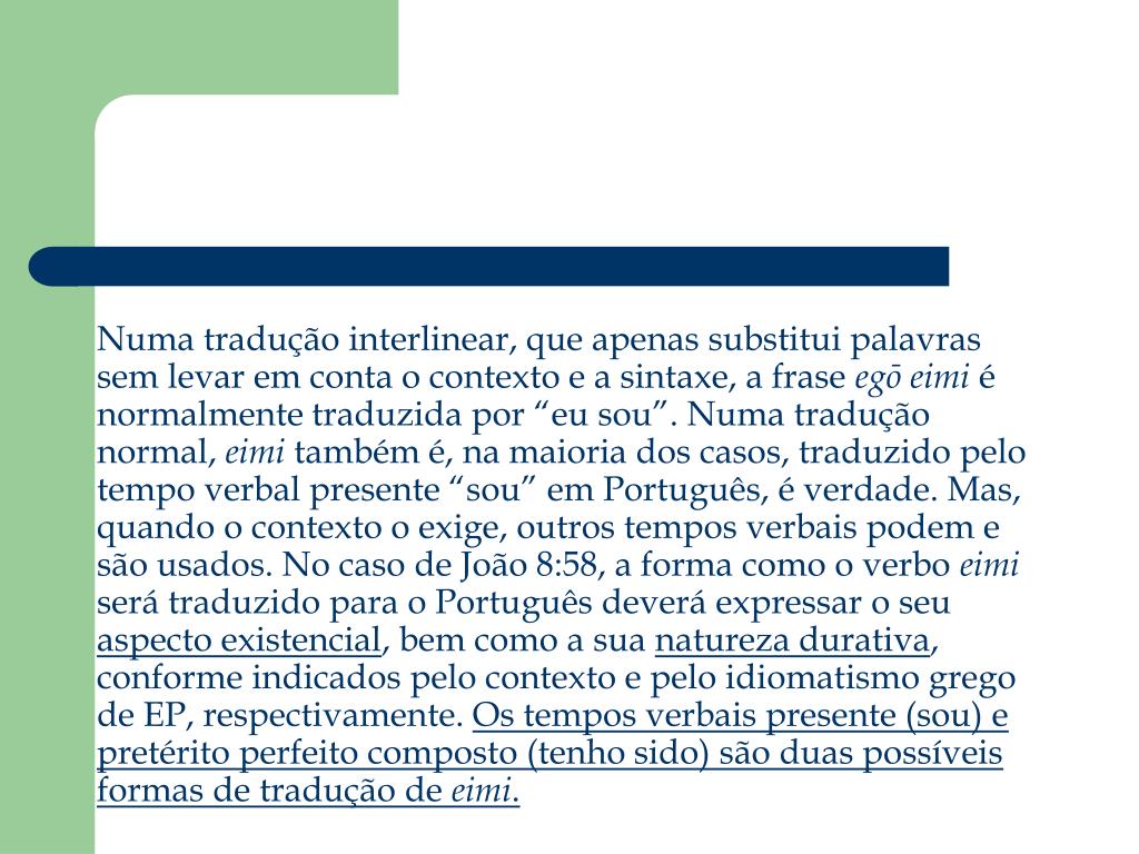Numa tradução interlinear, que apenas substitui palavras sem levar em conta o contexto e a sintaxe, a frase egō eimi é normalmente traduzida por “eu sou”. Numa tradução normal, eimi também é, na maioria dos casos, traduzido pelo tempo verbal presente “sou” em Português, é verdade. Mas, quando o contexto o exige, outros tempos verbais podem e são usados. No caso de João 8:58, a forma como o verbo eimi será traduzido para o Português deverá expressar o seu aspecto existencial, bem como a sua natureza durativa, conforme indicados pelo contexto e pelo idiomatismo grego de EP, respectivamente. Os tempos verbais presente (sou) e pretérito perfeito composto (tenho sido) são duas possíveis formas de tradução de eimi.