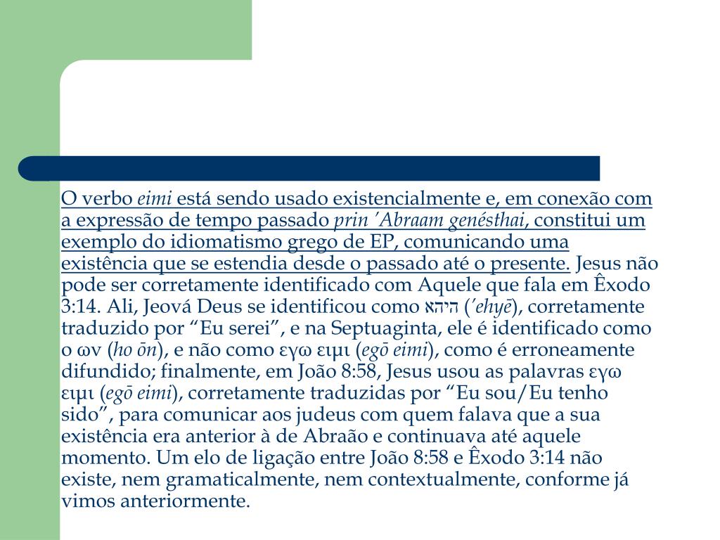 O verbo eimi está sendo usado existencialmente e, em conexão com a expressão de tempo passado prin ’Abraam genésthai, constitui um exemplo do idiomatismo grego de EP, comunicando uma existência que se estendia desde o passado até o presente. Jesus não pode ser corretamente identificado com Aquele que fala em Êxodo 3:14. Ali, Jeová Deus se identificou como היהא (’ehyē), corretamente traduzido por “Eu serei”, e na Septuaginta, ele é identificado como ο ων (ho ōn), e não como εγω ειμι (egō eimi), como é erroneamente difundido; finalmente, em João 8:58, Jesus usou as palavras εγω ειμι (egō eimi), corretamente traduzidas por “Eu sou/Eu tenho sido”, para comunicar aos judeus com quem falava que a sua existência era anterior à de Abraão e continuava até aquele momento. Um elo de ligação entre João 8:58 e Êxodo 3:14 não existe, nem gramaticalmente, nem contextualmente, conforme já vimos anteriormente.