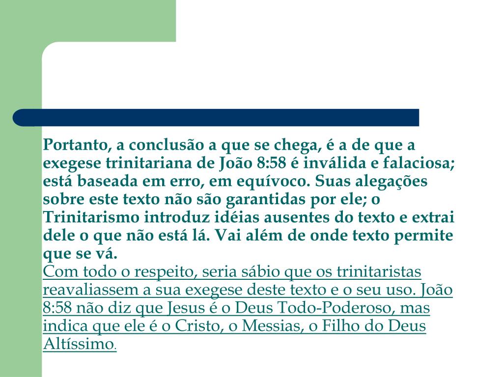Portanto, a conclusão a que se chega, é a de que a exegese trinitariana de João 8:58 é inválida e falaciosa; está baseada em erro, em equívoco. Suas alegações sobre este texto não são garantidas por ele; o Trinitarismo introduz idéias ausentes do texto e extrai dele o que não está lá. Vai além de onde texto permite que se vá. Com todo o respeito, seria sábio que os trinitaristas reavaliassem a sua exegese deste texto e o seu uso. João 8:58 não diz que Jesus é o Deus Todo-Poderoso, mas indica que ele é o Cristo, o Messias, o Filho do Deus Altíssimo.