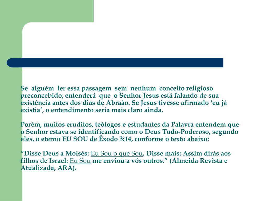 Se alguém ler essa passagem sem nenhum conceito religioso preconcebido, entenderá que o Senhor Jesus está falando de sua existência antes dos dias de Abraão. Se Jesus tivesse afirmado ‘eu já existia’, o entendimento seria mais claro ainda.Porém, muitos eruditos, teólogos e estudantes da Palavra entendem que o Senhor estava se identificando como o Deus Todo-Poderoso, segundo eles, o eterno EU SOU de Êxodo 3:14, conforme o texto abaixo:“Disse Deus a Moisés: Eu Sou o que Sou. Disse mais: Assim dirás aos filhos de Israel: Eu Sou me enviou a vós outros.” (Almeida Revista e Atualizada, ARA).