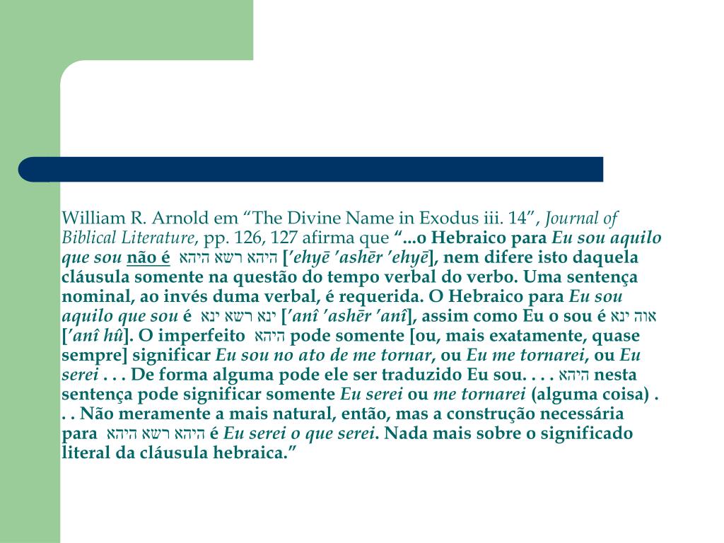 William R. Arnold em “The Divine Name in Exodus iii. 14”, Journal of Biblical Literature, pp. 126, 127 afirma que “...o Hebraico para Eu sou aquilo que sou não éהיהא רשא היהא [’ehyē ’ashēr ’ehyē], nem difere isto daquela cláusula somente na questão do tempo verbal do verbo. Uma sentença nominal, ao invés duma verbal, é requerida. O Hebraico para Eu sou aquilo que sou é ינא רשא ינא [’anî ’ashēr ’anî], assim como Eu o sou é אוהינא [’anî hû]. O imperfeito היהאpode somente [ou, mais exatamente, quase sempre] significar Eu sou no ato de me tornar, ou Eu me tornarei, ou Eu serei . . . De forma alguma pode ele ser traduzido Eu sou. . . . היהאnesta sentença pode significar somente Eu serei ou me tornarei (alguma coisa) . . . Não meramente a mais natural, então, mas a construção necessária para היהא רשא היהאé Eu serei o que serei. Nada mais sobre o significado literal da cláusula hebraica.”