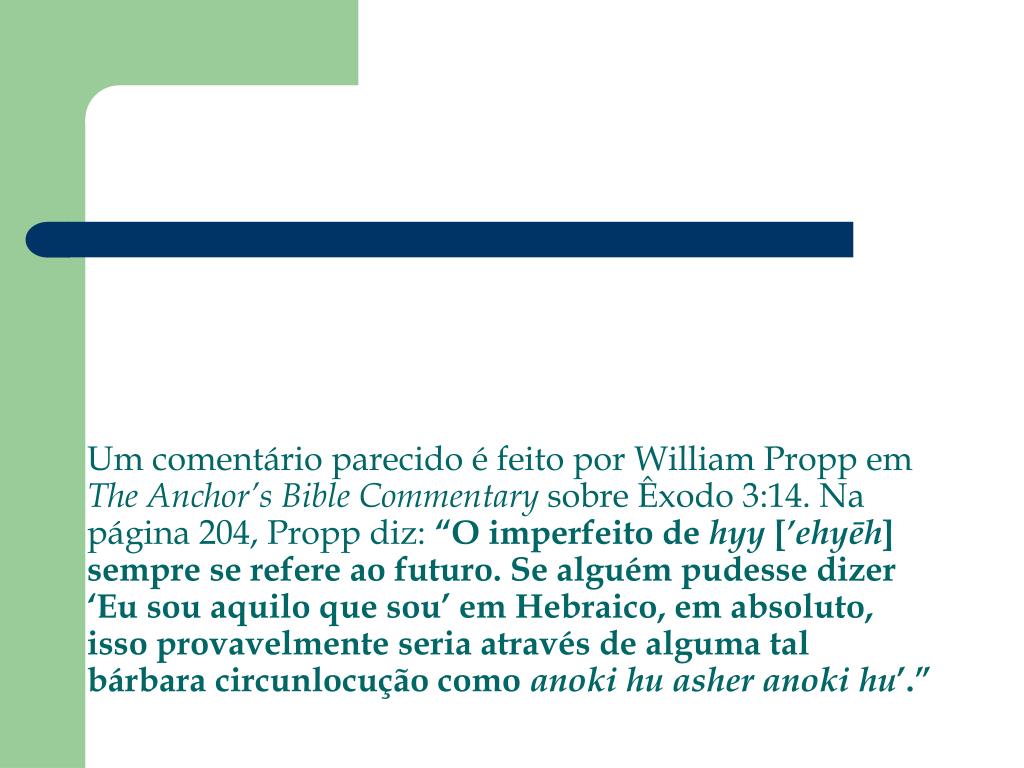 Um comentário parecido é feito por William Propp em The Anchor’s Bible Commentary sobre Êxodo 3:14. Na página 204, Propp diz: “O imperfeito de hyy [’ehyēh] sempre se refere ao futuro. Se alguém pudesse dizer ‘Eu sou aquilo que sou’ em Hebraico, em absoluto, isso provavelmente seria através de alguma tal bárbara circunlocução como anoki hu asher anoki hu’.”