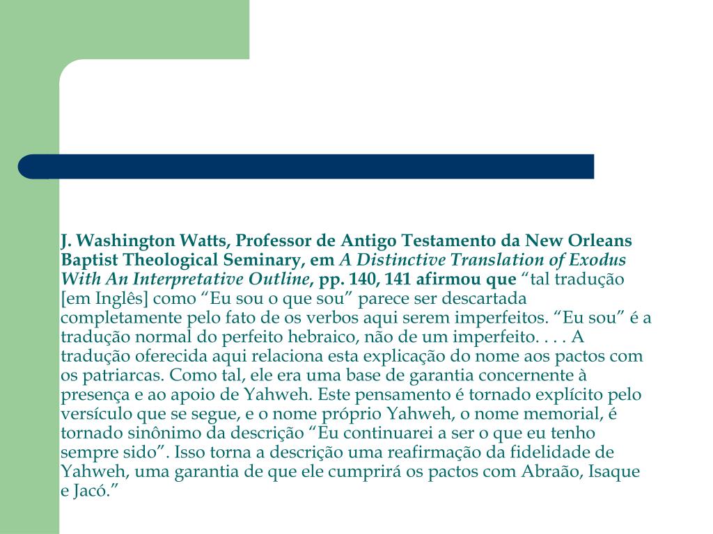 J. Washington Watts, Professor de Antigo Testamento da New Orleans Baptist Theological Seminary, em A Distinctive Translation of Exodus With An Interpretative Outline, pp. 140, 141 afirmou que “tal tradução [em Inglês] como “Eu sou o que sou” parece ser descartada completamente pelo fato de os verbos aqui serem imperfeitos. “Eu sou” é a tradução normal do perfeito hebraico, não de um imperfeito. . . . A tradução oferecida aqui relaciona esta explicação do nome aos pactos com os patriarcas. Como tal, ele era uma base de garantia concernente à presença e ao apoio de Yahweh. Este pensamento é tornado explícito pelo versículo que se segue, e o nome próprio Yahweh, o nome memorial, é tornado sinônimo da descrição “Eu continuarei a ser o que eu tenho sempre sido”. Isso torna a descrição uma reafirmação da fidelidade de Yahweh, uma garantia de que ele cumprirá os pactos com Abraão, Isaque e Jacó.”