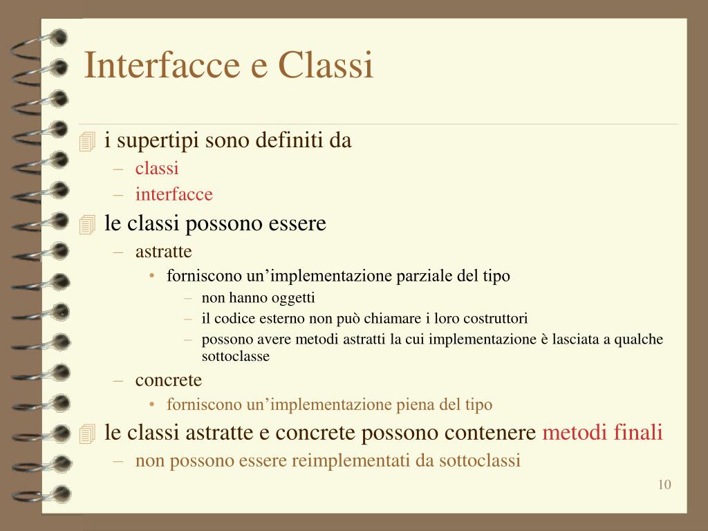 Interfacce e Classi • i supertipi sono definiti da • classi • interfacce • le classi possono essere • astratte • forniscono un’implementazione parziale del tipo • non hanno oggetti • il codice esterno non può chiamare i loro costruttori • possono avere metodi astratti la cui implementazione è lasciata a qualche sottoclasse • concrete • forniscono un’implementazione piena del tipo • le classi astratte e concrete possono contenere metodi finali • non possono essere reimplementati da sottoclassi