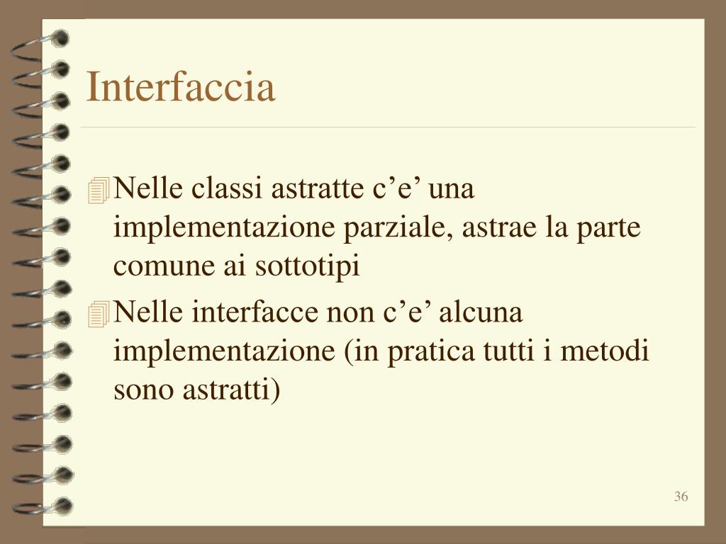 Interfaccia • Nelle classi astratte c’e’ una implementazione parziale, astrae la parte comune ai sottotipi • Nelle interfacce non c’e’ alcuna implementazione (in pratica tutti i metodi sono astratti)