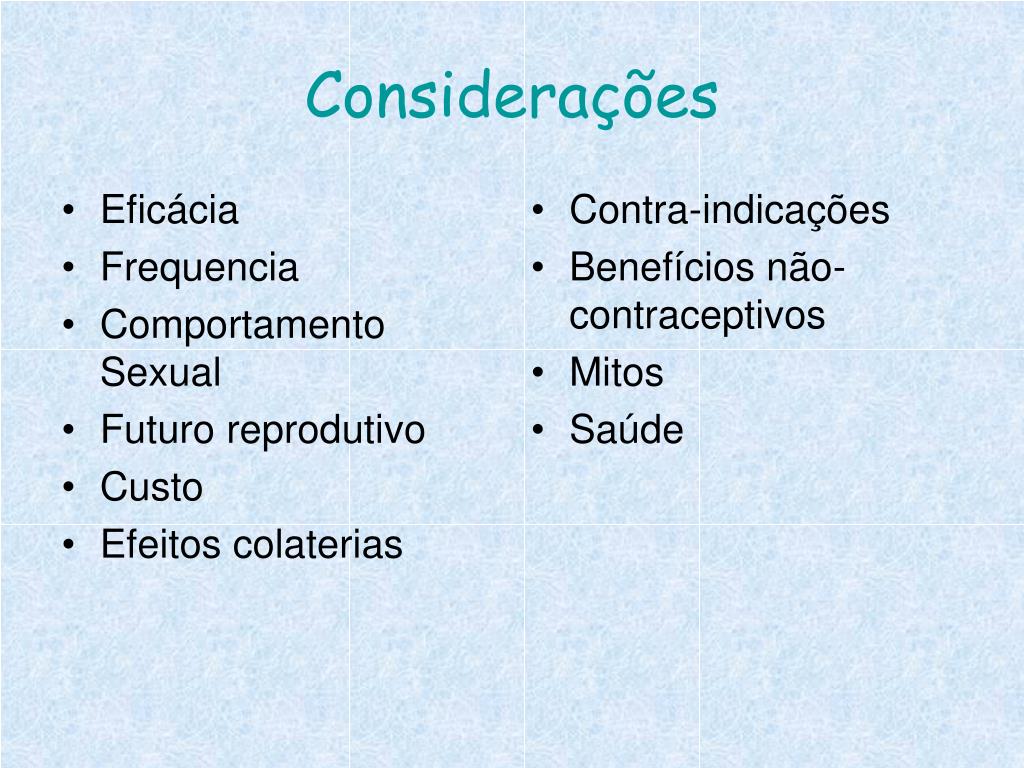Eficácia Frequencia Comportamento Sexual Futuro reprodutivo Custo Efeitos colaterias Contra-indicações Benefícios não-contraceptivos Mitos Saúde Considerações
