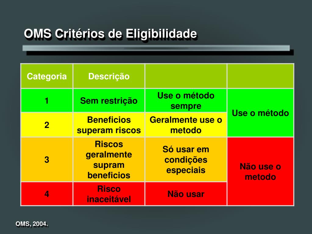 AOCs: Quem não Deve Usar(OMS Classe 4) • Está amamentando (< 6 semanas pós-parto) • Tem icterícia (hepatite viral sintomática ou cirrose) • Tem doença cardíaca isquêmica ou derrame (atual ou história de) • Tem distúrbios da coagulação sangüínea (trombose venosa profunda ou embolia pulmonar) • É fumante e tem 35 anos ou mais • É diabética • Tem pressão arterial elevada (> 180/110) • Tem câncer de mama • Tem tumores no fígado • Cirurgia de grande porte com permanência prolongada no leito • Enxaqueca com sinais neurológicos Fonte: OMS 2004.