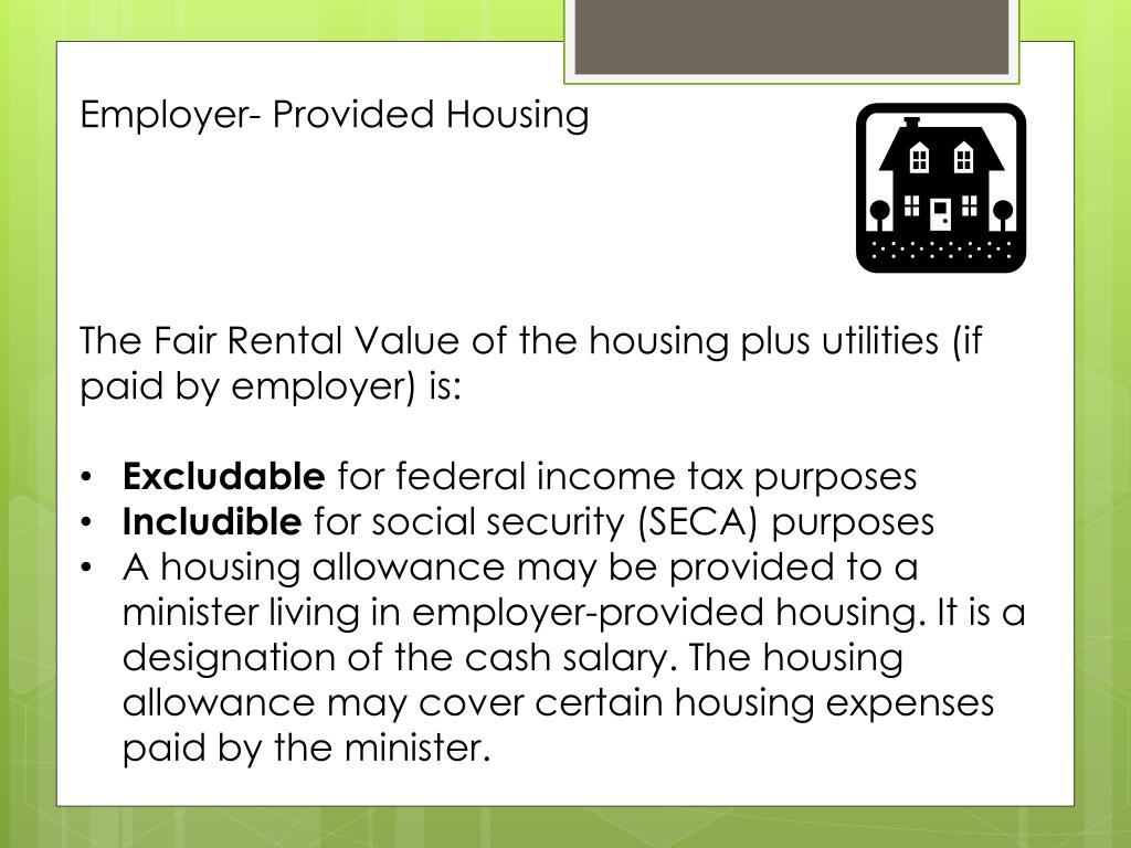 Employer- Provided Housing • The Fair Rental Value of the housing plus utilities (if paid by employer) is: • Excludable for federal income tax purposes • Includible for social security (SECA) purposes • A housing allowance may be provided to a minister living in employer-provided housing. It is a designation of the cash salary. The housing allowance may cover certain housing expenses paid by the minister.