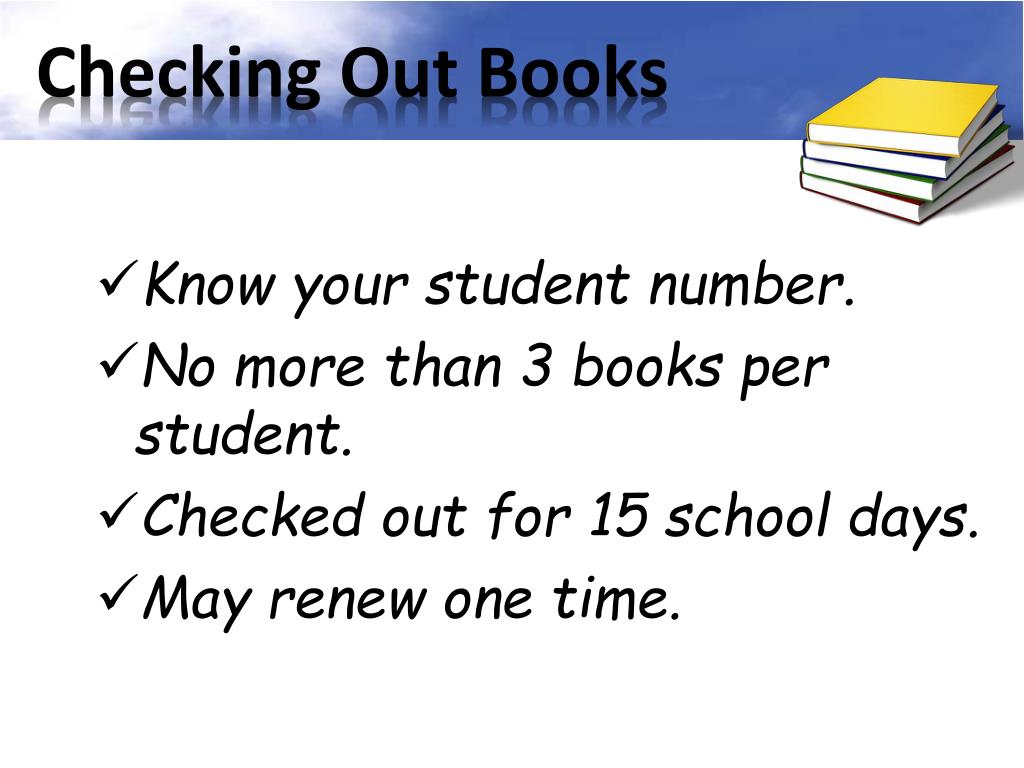 Checking Out Books • Know your student number. • No more than 3 books per student. • Checked out for 15 school days. • May renew one time.