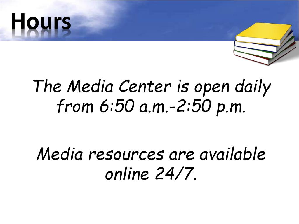 Hours The Media Center is open daily from 6:50 a.m.-2:50 p.m. Media resources are available online 24/7.