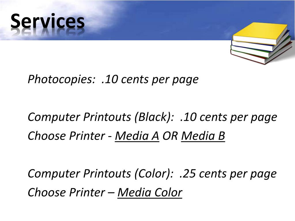 Services Photocopies: .10 cents per page Computer Printouts (Black): .10 cents per page Choose Printer - Media A OR Media B Computer Printouts (Color): .25 cents per page Choose Printer – Media Color