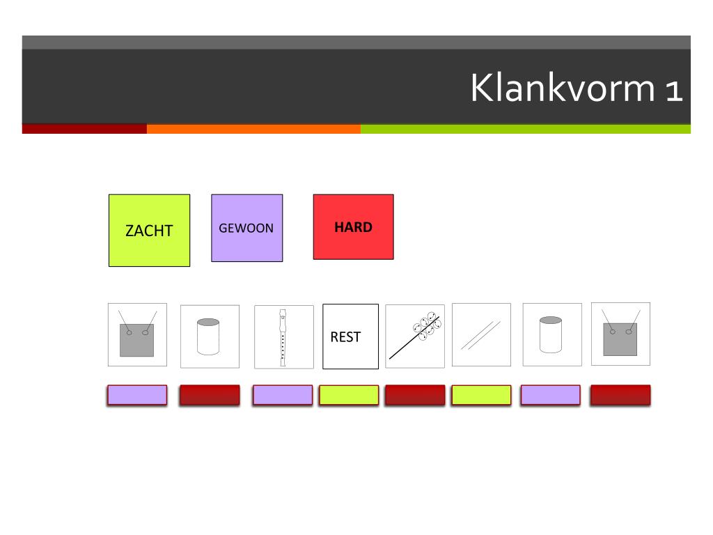 START- materiaal Klankeigenschappen muzikale aspecten. durven uiten verwondering aandacht openheid groepsgevoel samenspelen nieuwsgierig en kritisch creativiteit fantasie Maken Beluisteren Lezen en noteren Ontwerpen Bewegen Praten Klank Vorm Betekenis BETEKENIS: utilitaire functie, herkenbaarheid van de geluidsomgeving, mensen en dieren en andere dingen, stemmingen, muziek voor blije gebeurtenissen , sferen (nachtmuziek), jingles , in de kerk, op straat, muzak, op concerten Het kan de betekenis zijn die de kunstenaar heeft bedoeld of de betekenis die je er zelf aan geeft VORMGEVING. De ‘werkwoorden’ van de vormgever zijn: verlengen, verstillen, wachten, toevoegen, wegnemen, veranderen, …. Je zet dus klankeigenschappen en muzikale aspecten in om, vertrekkend van je starmateriaal, een bepaalde boodschap duidelijk te maken. Vormgeven is in functie van betekenissen.