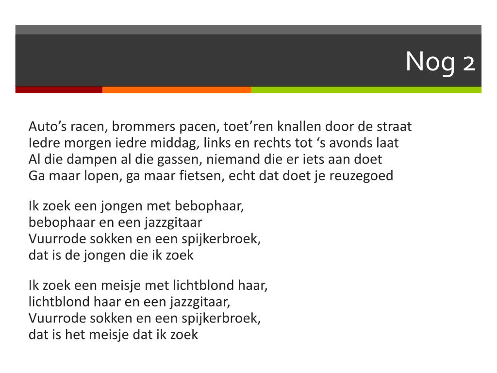 Nog 2 Auto’s racen, brommers pacen, toet’ren knallen door de straatIedre morgen iedre middag, links en rechts tot ‘s avonds laatAl die dampen al die gassen, niemand die er iets aan doetGa maar lopen, ga maar fietsen, echt dat doet je reuzegoed Ik zoek een jongen met bebophaar, bebophaar en een jazzgitaarVuurrode sokken en een spijkerbroek, dat is de jongen die ik zoek Ik zoek een meisje met lichtblond haar, lichtblond haar en een jazzgitaar,Vuurrode sokken en een spijkerbroek, dat is het meisje dat ik zoek