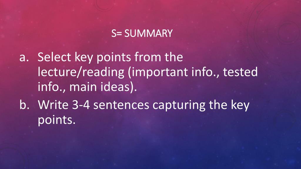 S= Summary • Select key points from the lecture/reading (important info., tested info., main ideas). • Write 3-4 sentences capturing the key points.