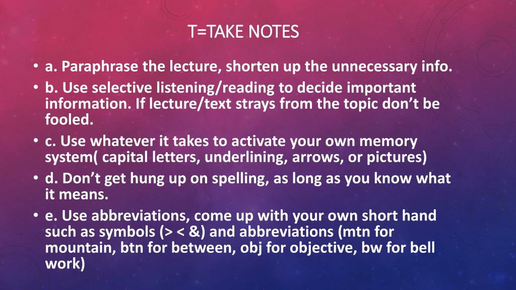 T=Take notes • a. Paraphrase the lecture, shorten up the unnecessary info. • b. Use selective listening/reading to decide important information. If lecture/text strays from the topic don’t be fooled. • c. Use whatever it takes to activate your own memory system( capital letters, underlining, arrows, or pictures) • d. Don’t get hung up on spelling, as long as you know what it means. • e. Use abbreviations, come up with your own short hand such as symbols (> < &) and abbreviations (mtn for mountain, btn for between, obj for objective, bw for bell work)