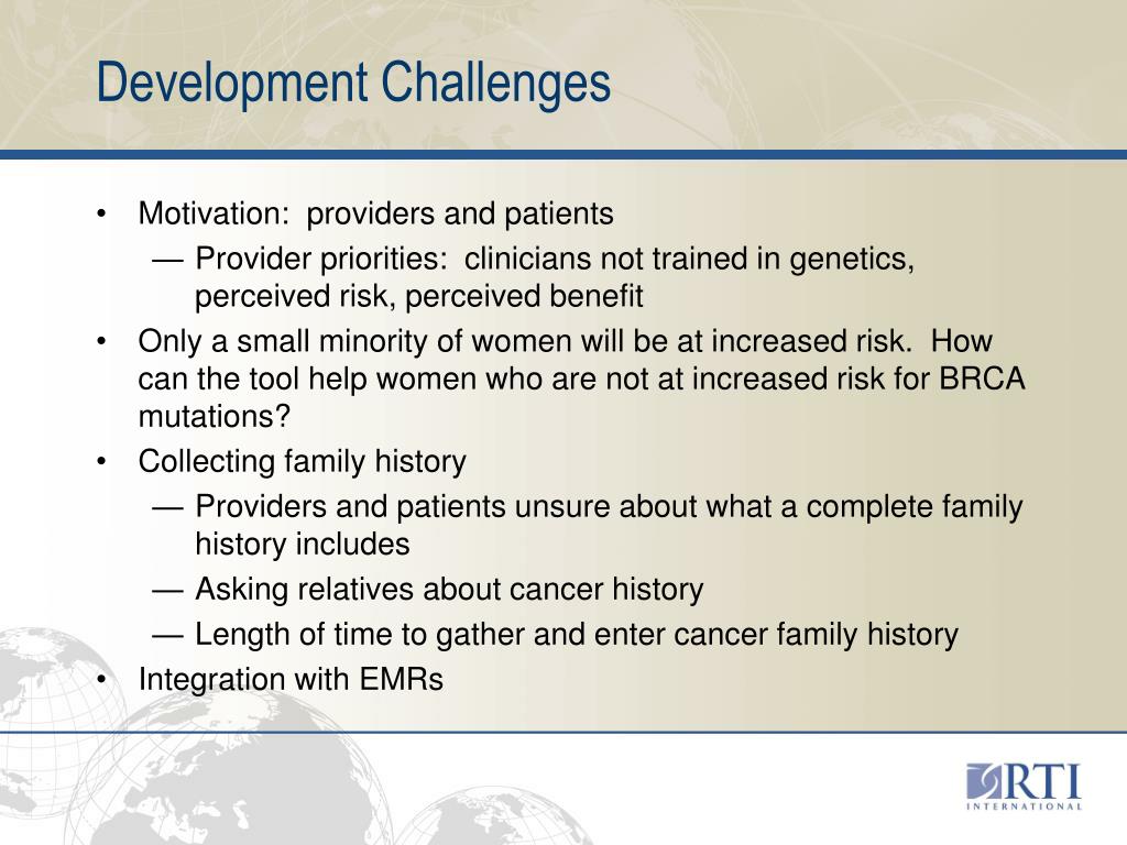 Development Challenges • Motivation: providers and patients • Provider priorities: clinicians not trained in genetics, perceived risk, perceived benefit • Only a small minority of women will be at increased risk. How can the tool help women who are not at increased risk for BRCA mutations? • Collecting family history • Providers and patients unsure about what a complete family history includes • Asking relatives about cancer history • Length of time to gather and enter cancer family history • Integration with EMRs