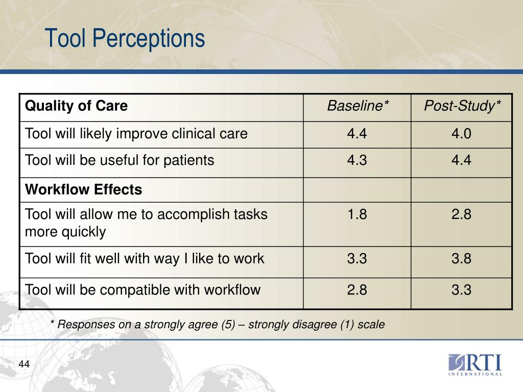 Tool Perceptions * Responses on a strongly agree (5) – strongly disagree (1) scale 43