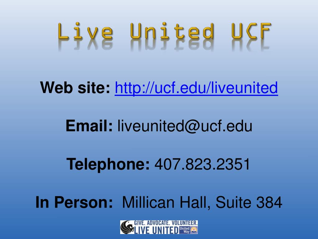 Live United UCF Web site: http://ucf.edu/liveunited Email: liveunited@ucf.edu Telephone: 407.823.2351 In Person: Millican Hall, Suite 384