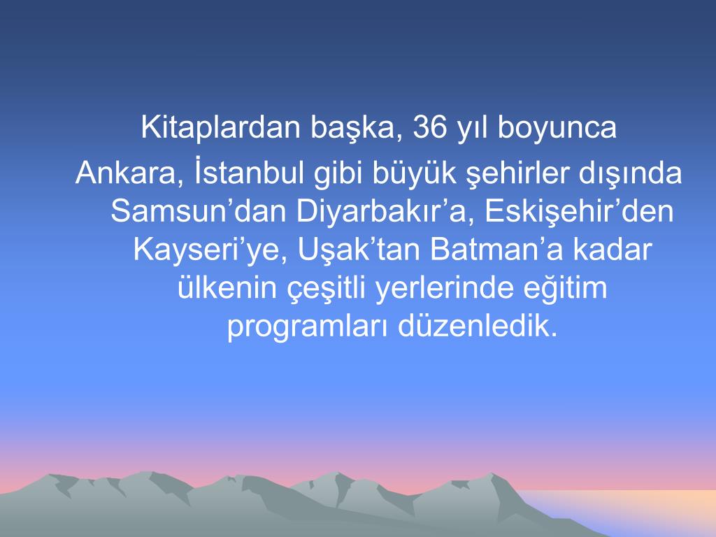 Kitaplardan başka, 36 yıl boyunca Ankara, İstanbul gibi büyük şehirler dışında Samsun’dan Diyarbakır’a, Eskişehir’den Kayseri’ye, Uşak’tan Batman’a kadar ülkenin çeşitli yerlerinde eğitim programları düzenledik.