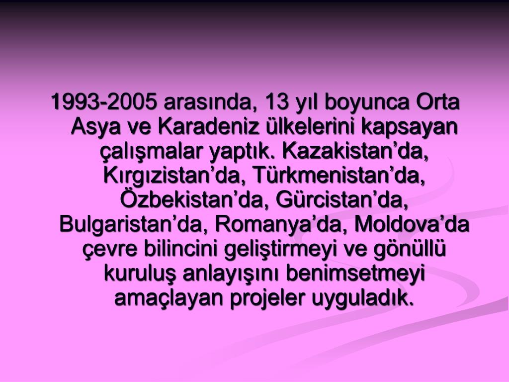 1993-2005 arasında, 13 yıl boyunca Orta Asya ve Karadeniz ülkelerini kapsayan çalışmalar yaptık. Kazakistan’da, Kırgızistan’da, Türkmenistan’da, Özbekistan’da, Gürcistan’da, Bulgaristan’da, Romanya’da, Moldova’da çevre bilincini geliştirmeyi ve gönüllü kuruluş anlayışını benimsetmeyi amaçlayan projeler uyguladık.