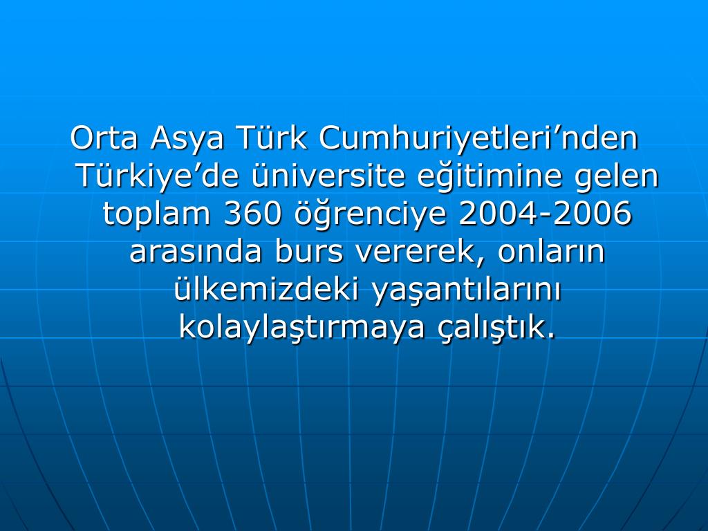 Orta Asya Türk Cumhuriyetleri’nden Türkiye’de üniversite eğitimine gelen toplam 360 öğrenciye 2004-2006 arasında burs vererek, onların ülkemizdeki yaşantılarını kolaylaştırmaya çalıştık.