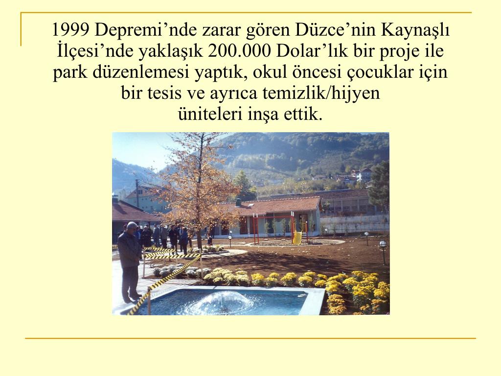 1999 Depremi’nde zarar gören Düzce’nin Kaynaşlı İlçesi’nde yaklaşık 200.000 Dolar’lık bir proje ile park düzenlemesi yaptık, okul öncesi çocuklar için bir tesis ve ayrıca temizlik/hijyen üniteleri inşa ettik.