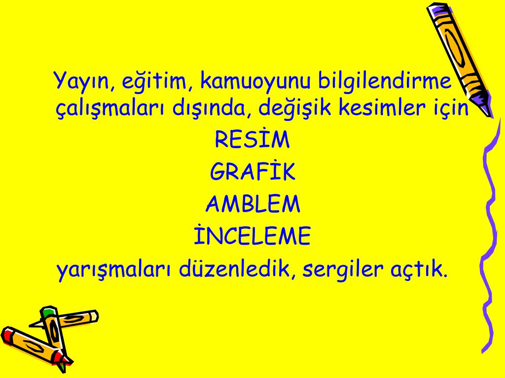 Yayın, eğitim, kamuoyunu bilgilendirme çalışmaları dışında, değişik kesimler için RESİM GRAFİK AMBLEM İNCELEME yarışmaları düzenledik, sergiler açtık.
