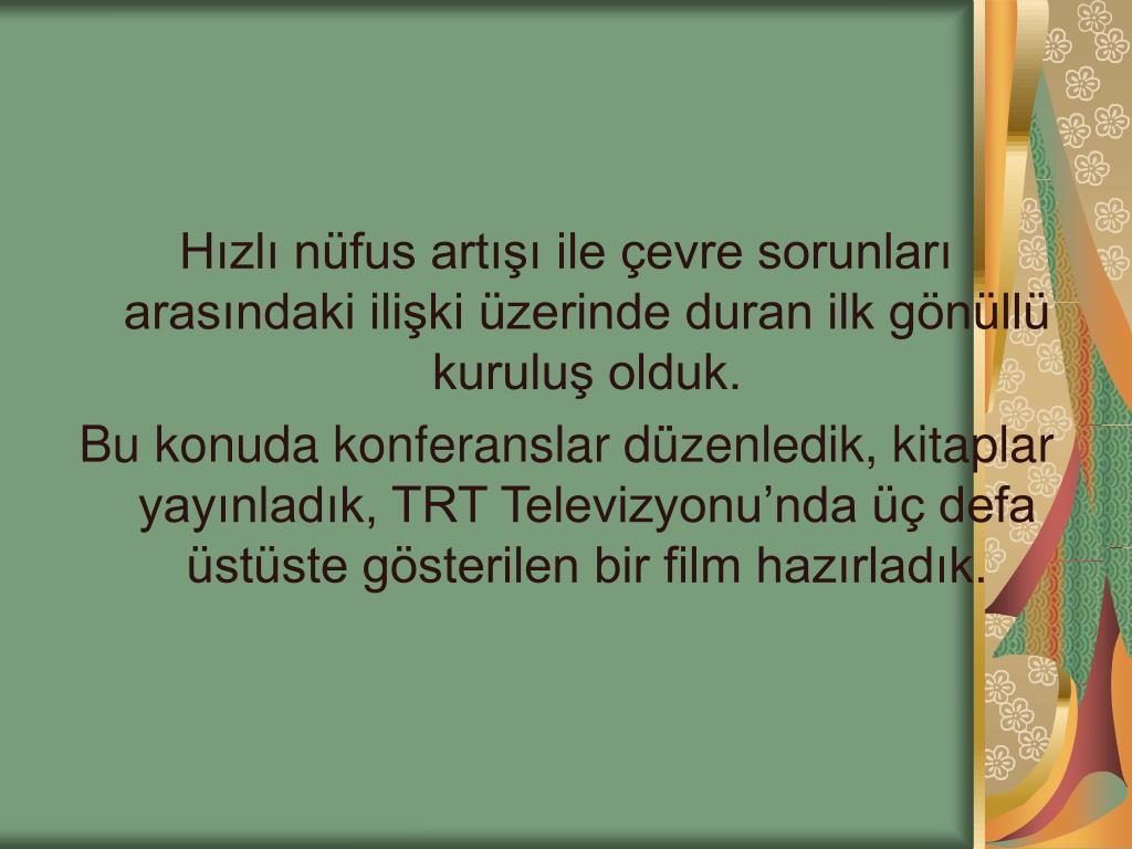 Hızlı nüfus artışı ile çevre sorunları arasındaki ilişki üzerinde duran ilk gönüllü kuruluş olduk. Bu konuda konferanslar düzenledik, kitaplar yayınladık, TRT Televizyonu’nda üç defa üstüste gösterilen bir film hazırladık.