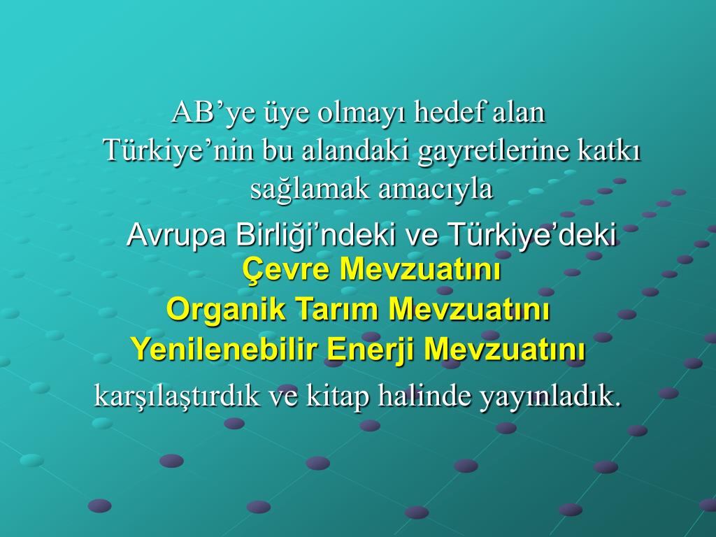 AB’ye üye olmayı hedef alan Türkiye’nin bu alandaki gayretlerine katkı sağlamak amacıyla Avrupa Birliği’ndeki ve Türkiye’dekiÇevre Mevzuatını Organik Tarım Mevzuatını Yenilenebilir Enerji Mevzuatını karşılaştırdık ve kitap halinde yayınladık.