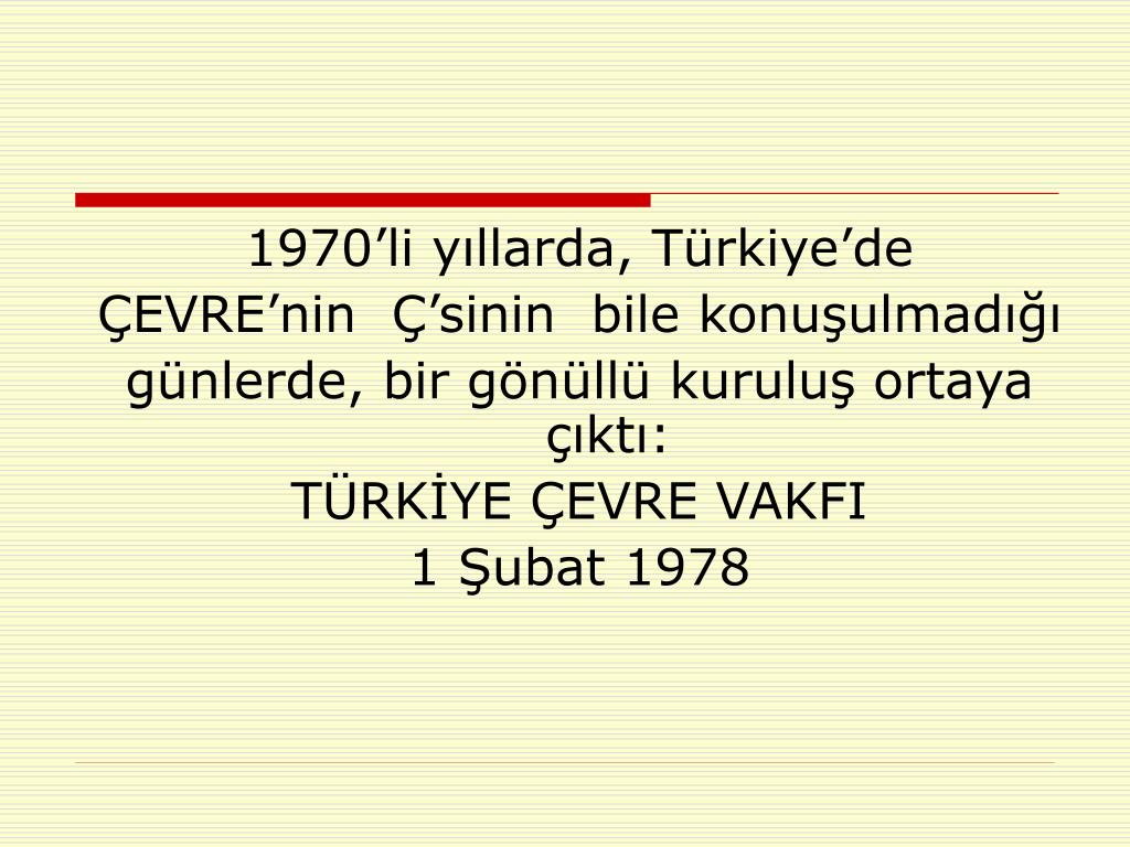 1970’li yıllarda, Türkiye’de ÇEVRE’nin Ç’sinin bile konuşulmadığı günlerde, bir gönüllü kuruluş ortaya çıktı: TÜRKİYE ÇEVRE VAKFI 1 Şubat 1978