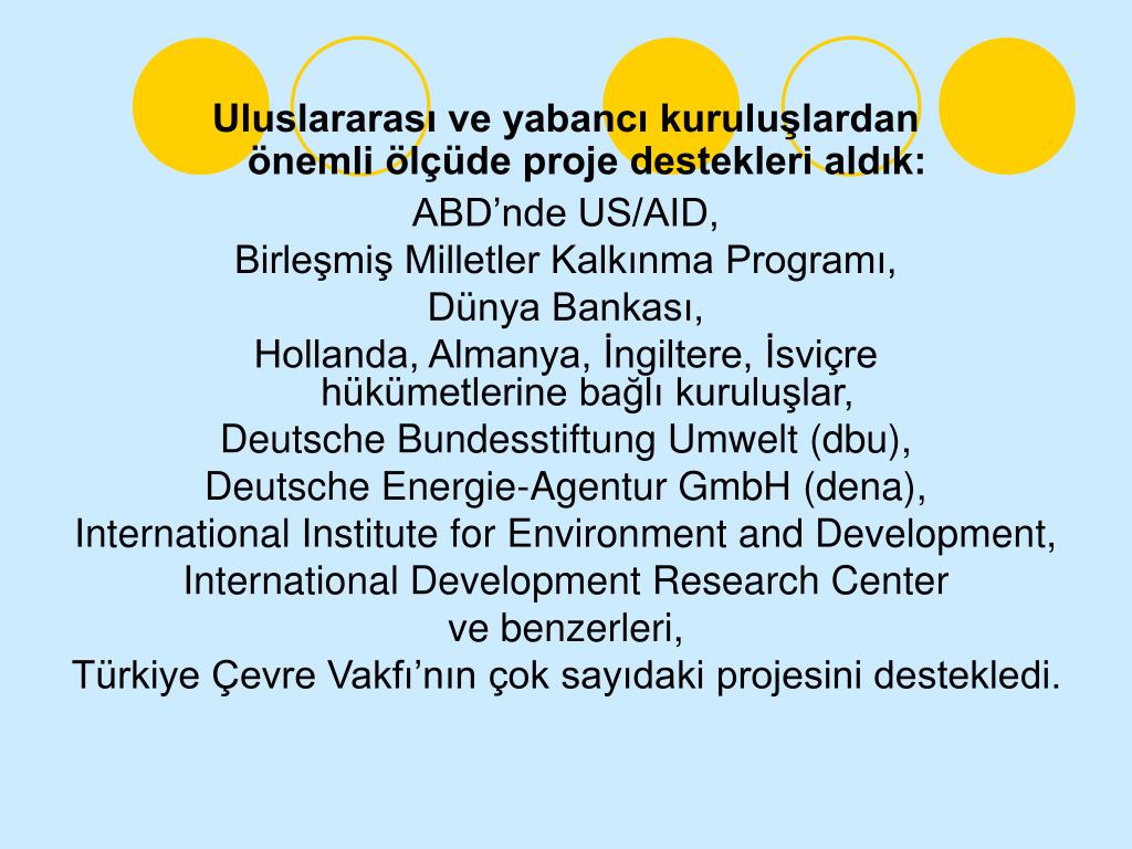 Uluslararası ve yabancı kuruluşlardan önemli ölçüde proje destekleri aldık: ABD’nde US/AID, Birleşmiş Milletler Kalkınma Programı, Dünya Bankası, Hollanda, Almanya, İngiltere, İsviçre hükümetlerine bağlı kuruluşlar, Deutsche Bundesstiftung Umwelt (dbu), Deutsche Energie-Agentur GmbH (dena), International Institute for Environment and Development, International Development Research Center ve benzerleri, Türkiye Çevre Vakfı’nın çok sayıdaki projesini destekledi.