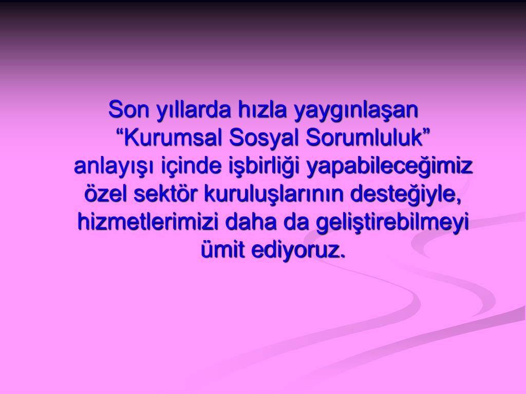 Son yıllarda hızla yaygınlaşan “Kurumsal Sosyal Sorumluluk” anlayışı içinde işbirliği yapabileceğimiz özel sektör kuruluşlarının desteğiyle, hizmetlerimizi daha da geliştirebilmeyi ümit ediyoruz.