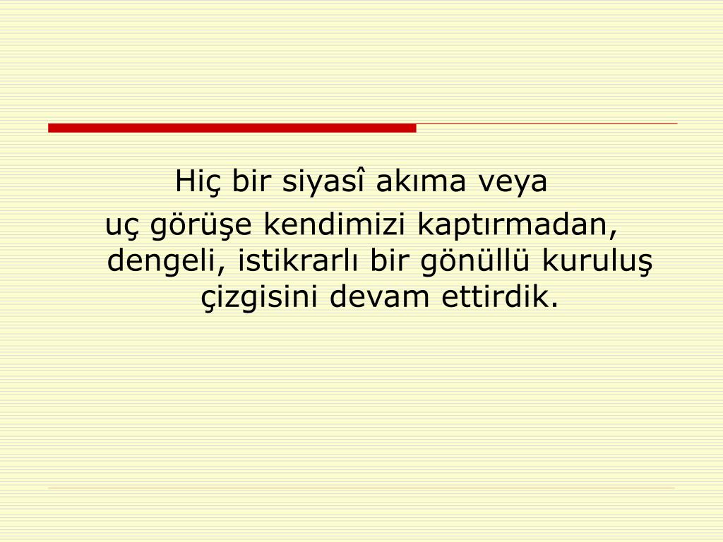 Hiç bir siyasî akıma veya uç görüşe kendimizi kaptırmadan, dengeli, istikrarlı bir gönüllü kuruluş çizgisini devam ettirdik.