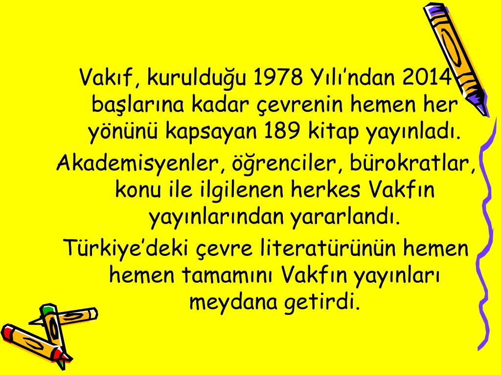 Vakıf, kurulduğu 1978 Yılı’ndan 2014 başlarına kadar çevrenin hemen her yönünü kapsayan 189 kitap yayınladı. Akademisyenler, öğrenciler, bürokratlar, konu ile ilgilenen herkes Vakfın yayınlarından yararlandı. Türkiye’deki çevre literatürünün hemen hemen tamamını Vakfın yayınları meydana getirdi.