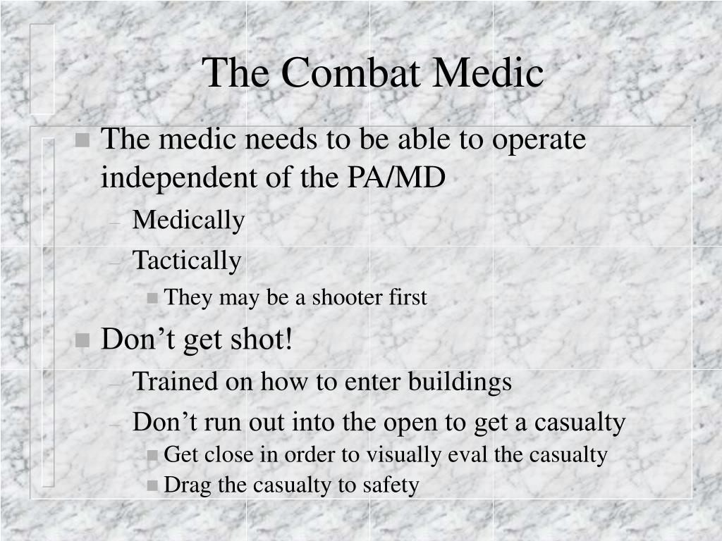 The Combat Medic • The medic needs to be able to operate independent of the PA/MD • Medically • Tactically • They may be a shooter first • Don’t get shot! • Trained on how to enter buildings • Don’t run out into the open to get a casualty • Get close in order to visually eval the casualty • Drag the casualty to safety