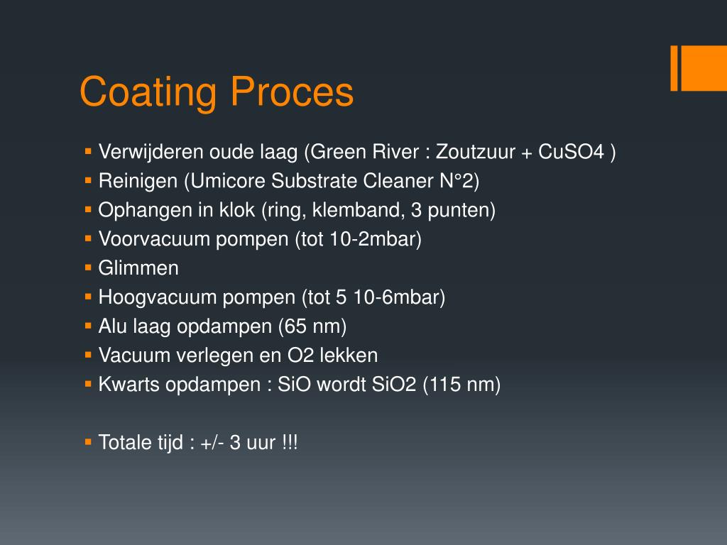 Coating Proces • Verwijderen oude laag (Green River : Zoutzuur + CuSO4 ) • Reinigen (UmicoreSubstrate Cleaner N°2) • Ophangen in klok (ring, klemband, 3 punten) • Voorvacuum pompen (tot 10-2mbar) • Glimmen • Hoogvacuum pompen (tot 5 10-6mbar) • Alu laag opdampen (65 nm) • Vacuum verlegen en O2 lekken • Kwarts opdampen : SiO wordt SiO2 (115 nm) • Totale tijd : +/- 3 uur !!!