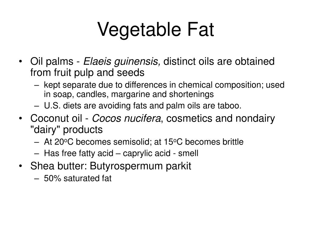 Vegetable Fat • Oil palms - Elaeis guinensis, distinct oils are obtained from fruit pulp and seeds • kept separate due to differences in chemical composition; used in soap, candles, margarine and shortenings • U.S. diets are avoiding fats and palm oils are taboo. • Coconut oil - Cocos nucifera, cosmetics and nondairy "dairy" products • At 20oC becomes semisolid; at 15oC becomes brittle • Has free fatty acid – caprylic acid - smell • Shea butter: Butyrospermum parkit • 50% saturated fat