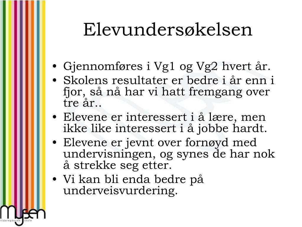 Elevundersøkelsen • Gjennomføres i Vg1 og Vg2 hvert år. • Skolens resultater er bedre i år enn i fjor, så nå har vi hatt fremgang over tre år.. • Elevene er interessert i å lære, men ikke like interessert i å jobbe hardt. • Elevene er jevnt over fornøyd med undervisningen, og synes de har nok å strekke seg etter. • Vi kan bli enda bedre på underveisvurdering.